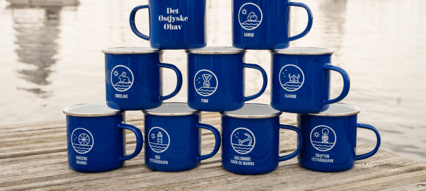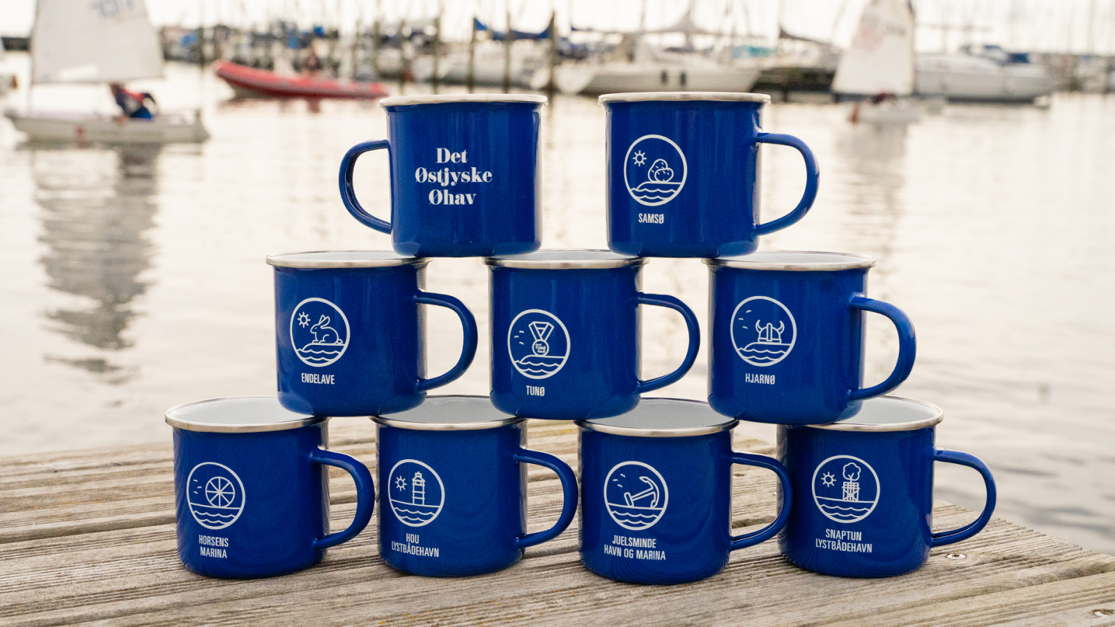 Möchten Sie Ihre eigene Sammlung von Tassen aus dem ostjütländischen Inselmeer besitzen? Dann gibt es nur einen Weg: Sammeln Sie die Tassen bei jedem Besuch der acht Häfen des Inselmeers. Die marineblauen Tassen bestehen aus Stahl und Emaille und sind äußerst robust. Der Preis pro Tasse beträgt 99,00 DKK.